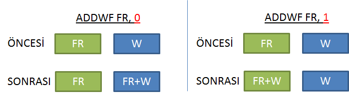 ADDWF FR, H | FR+W⇒W (H=0 ise), FR+W⇒FR (H=1 ise) W ile FR'yi toplar ve sonucu hedef H'ye yazar. |