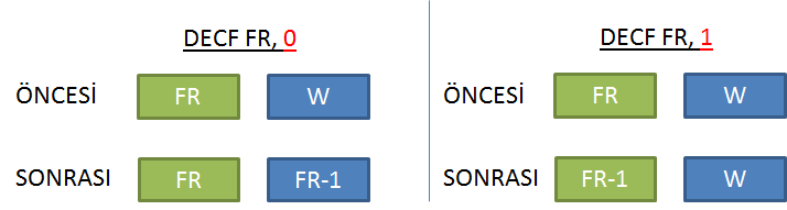 DECF FR, H | FR-1⇒W (H=0 ise), FR-1⇒FR (H=1 ise) FR'yi bir azaltır ve sonucu hedef H'ye yazar. |