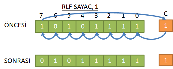 RLF FR, H | FR<1⇒W (H=0 ise), FR<1⇒FR (H=1 ise) Carry Flag üzerinde FR'yi bir bit sola kaydırır ve sonucu hedef H'ye yazar. |