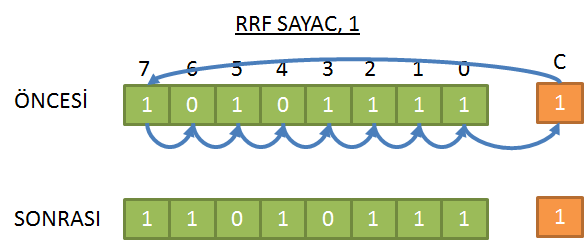 RRF FR, H | FR>1⇒W (H=0 ise), FR>1⇒FR (H=1 ise) Carry Flag üzerinde FR'yi bir bit sola kaydırır ve sonucu hedef H'ye yazar. |