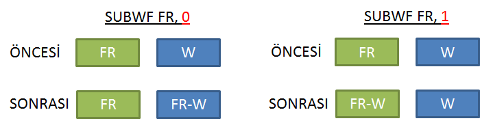 SUBWF FR, H | FR-W⇒W (H=0 ise), FR-W⇒FR (H=1 ise) FR'den W'yu çıkarır ve sonucu hedef H'ye yazar. |